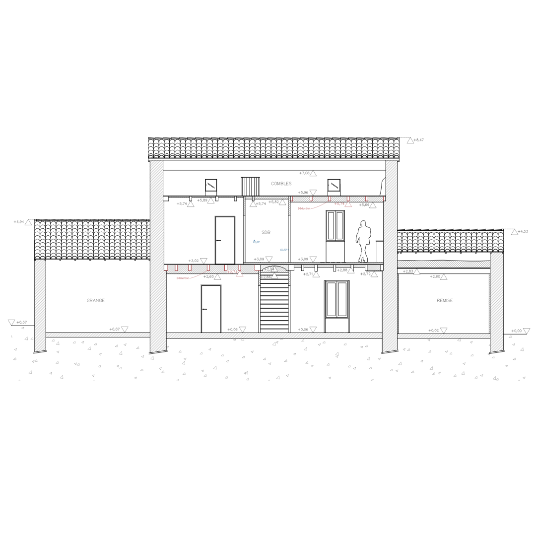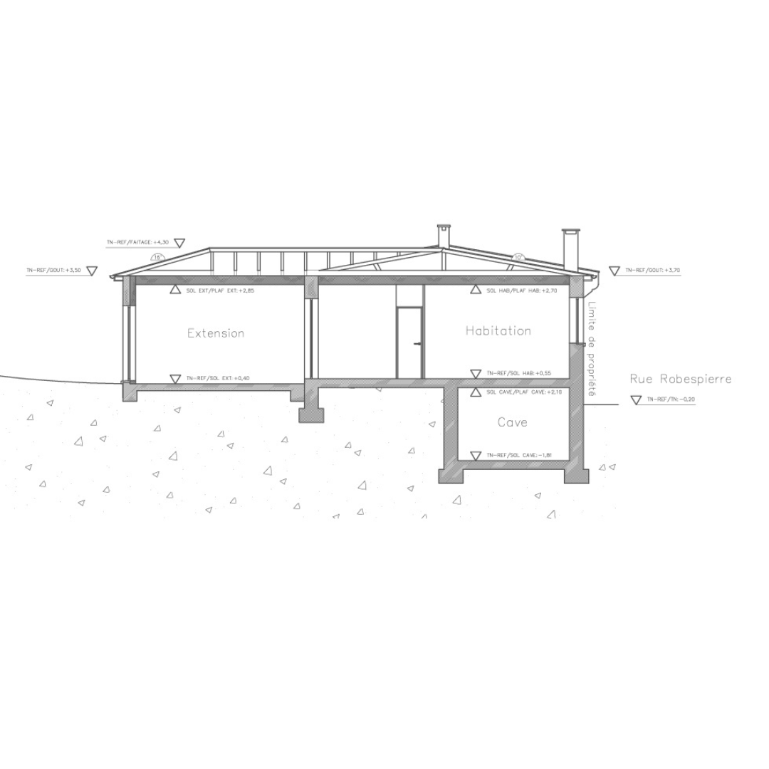 Un plan de coupe est un dessin qui illustre une construction avec une coupe verticale, un peu comme si vous découpiez le bâtiment en deux parties pour observer toutes les épaisseurs de mur et de plancher. Il permet d'observer les différentes hauteurs sous plafond, les fondations, ainsi que la manière dont la construction est implantée sur son terrain.